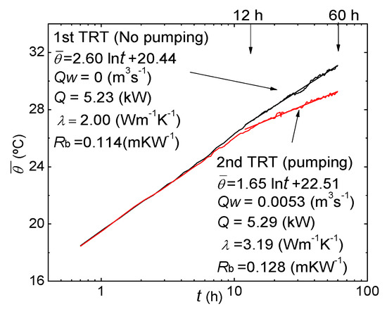 Figure 4 shows the average fluid temperatures θ ¯ measured by the PT100 sensors and the fitted lines for the determination of kt based on Equation (2). The measurement data set is included in the excel file as the supplementary material. The temperatures in the first and second TRTs increased during the heating process. The temperature increase was almost the same during both TRTs until the elapsed time of approximately t = 10 h because heating was dominant in the borehole. After approximately t = 10 h, the temperature increase was smaller in the second TRT than that in the first TRT. The relatively small increase in the second TRT was due to the heat advection caused by artificial groundwater flow. The average effective thermal conductivity λ was calculated using Equation (2). In the first TRT, λ = 2.00 W m−1 K−1, which is that of ‘Light sand and 15% water’ in Table 5 of Chapter 34 in [10]. In the second TRT, average effective thermal conductivity was λ = 3.19 W m−1 K−1, which was almost 1.6 times larger than that during the first TRT. Additionally, the thermal resistance value of the BHE was calculated using Equation (4). In the first TRT, Rb = 0.114 m KW−1, and Rb = 0.128 m KW−1 during the second TRT, were almost the same in terms of an error criterion of Rb as described above (10%–15%), and were reasonable based on Table 6 in [10].