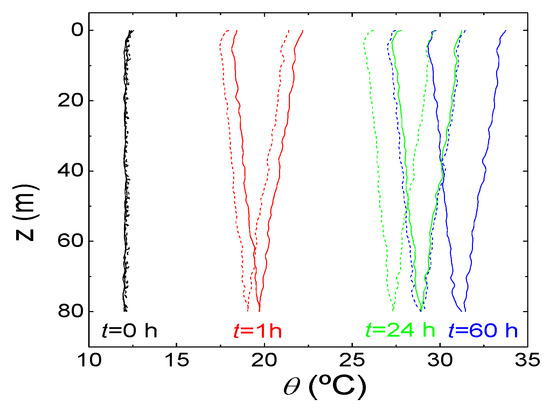 The line heat source analysis was based on the minimum elapsed time required to transform the original error function into a logarithmic function and the maximum time required to approach steady state rather than radial heat conduction [11]. This study analyzed the temperature data during the heating period between t = 12 h and 60 h, as recommended in [28]. Additionally, in this analysis, the thickness in each sub-layer should be assigned to validate the line heat source assumption. Although the BHE in each sub-layer has a limited length, the temperatures based on the finite line source model were practically the same with those based on the infinite line source when the vertical length was about 10 m (40 feet) [25]. As a field study [17], our previous study conducted in Asahikawa City, Hokkaido, Japan, indicated that the effective thermal conductivity was approximately constant when the thickness was at least 10 m. Thus, this study assumed that the thickness required to validate the line heat source assumption was constant at 10 m, and the formation around the BHE (L = 80 m) was assumed to consist of 8 sub-layers of 10 m in thickness. The DTS measurement interval was dz = 0.5 m. Temperature data recorded at 21 depths were used for the regression analysis of qi and kti in each sub-layer. This study also calculated the total heat exchange rate Q* from qi and the average effective thermal conductivity λ* from λi. Additionally, Q* and λ* were compared with the standard test results based on Q in Equation (3) and λ in Equation (2).