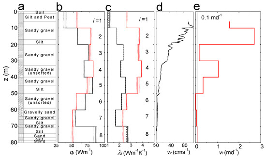 Figure 6 summarizes the measurement and analysis results of the TRTs. The profile of kti was omitted due to the minimal variations in the vertical direction. The geologic column at the test site indicated that the formation at this site was composed mainly of Aquifer I (unsaturated fine deposits; z = 0 to 5 m), Aquifers II and III (upper aquifers of sandy gravel deposits; z = 5 to 45 m), and Aquifer IV (alternating fine and coarse sediments; z = 45 to 80 m). This composition was similar to that shown in Figure 1c. A comparison between Figure 6b,c indicates that the layers of relatively high qi values were potentially related to the layers of relatively high λi values in both TRTs. The standard deviations of qi and λi were within 10%, respectively. In Figure 6c, during the first TRT (black lines), the effective thermal conductivity in the first layer (z = 0 to 10 m) was relatively small (λ1 = 1.18 W m−1 K−1) due to the unsaturated conditions above the water table (z = 6 m). The effective thermal conductivities in the second to eighth layers fluctuated, but the difference was within 15% of the average in the layers (2.21 W m−1 K−1). During the second TRT (red lines), the effective thermal conductivities were larger than those during the first TRT, except for the value in the eighth layer. In the second to fifth layers, the effective thermal conductivities were commonly greater than 3.5 W m−1 K−1. The average conductivity in the upper layers was 3.73 W m−1 K−1, which was almost double the average conductivity along the BHE (λ = 2.00 W m−1 K−1).