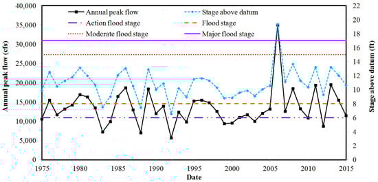 The historical annual peak flow/stage and various flood stage levels in the Grand River, Ohio, as per NWS [28], is shown in Figure 2. The unsteady model was calibrated and validated for both stage and discharge. The performance of the model showed good calibration and validation for the time period of 1996–1998, which was evaluated using statistical parameters and visual inspection method.