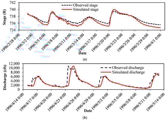 Calibration of stage/discharge for upstream and downstream gage station (Lamichhane, 2016). (a) Calibration of stage from 1 March 1996 to 31 March 1996 at upstream gage station 04211820; (b) Calibration of discharge from 15 April 1996 to 14 May 1996 at downstream gage station 04212100.