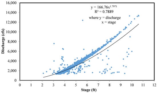 The rating curve for the stream gage near the city of Painesville was developed using 75 percentile exceedance discharge values for the period of 1988–2005 in order to capture all the high flood discharge values (Figure 4). The equation used for developing the rating curve is given below.