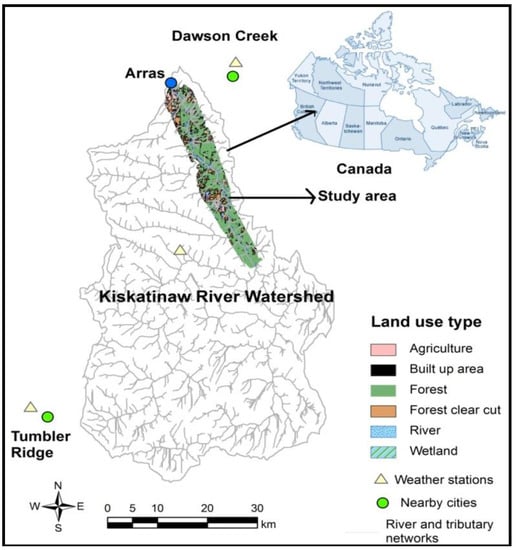 The study area (213.82 km2) is situated along the main stem of the Kiskatinaw River in the KRW (Figure 1). The City of Dawson Creek’s drinking water intake of the water supply system is located at Arras in the study area. The elevation of the study area ranges from 687 m to 950 m, and the mean slope is 7.8% []. The dominant soil texture in the study area is mainly clay loam (91%), although silt loam and sandy loam occupy 6% and 3% of the study area, respectively. The study area is mainly a forested area (68%) (Figure 1). Other land use types are forest clear cut (18.7%), agriculture (8%), wetland (2%), water (1.8%), and built up area (1.5%).