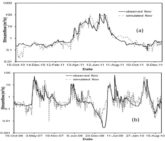 Observed and simulated stream flows by the GSSHA model at the outlet of the study area during (a) calibration and (b) validation periods.
