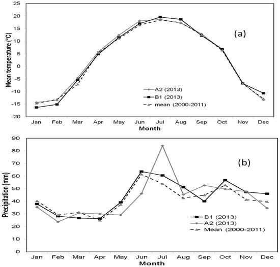 The temperature outputs from the delta change method showed that the trend of the mean monthly temperatures in 2013 under the A2 and B1 scenarios was similar to those of 2000–2011; with the highest and lowest mean monthly temperatures occurring in July and January, respectively, (Figure 3a). It was also found that the mean monthly temperatures under the A2 scenario were associated with higher values than under the B1 scenario for most of the months, except in July, August, October, and December. The mean annual temperature in 2013 under the A2 and B1 scenarios was 3.29 °C and 3.05 °C, respectively, which was above by 0.59 °C and 0.35 °C as compared to those of 2000–2011, respectively. This variability occurred because of the anthropogenic increases in the atmospheric concentrations of greenhouse gases [,].