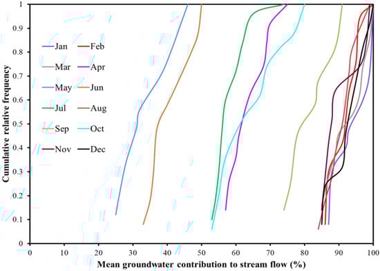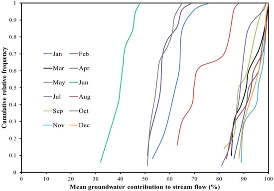 Cumulative relative frequency distribution of mean groundwater contributions to stream flow in different months of 2013 under the A2 GHG emission scenario.