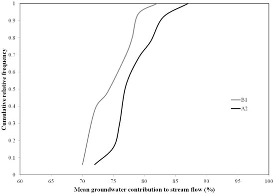 Cumulative relative frequency distribution of mean annual groundwater contributions to the stream flow in 2013 under the A2 and B1 GHG emission scenarios.