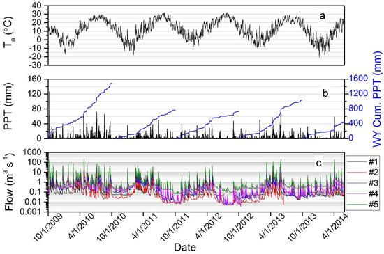 Five-site-average air temperature (Ta; °C) (panel a), five-site-average daily precipitation (PPT; mm), cumulative water year precipitation (WY Cum. PPT; mm) (panel b), and average daily streamflow (m3 s−1) (panel c) at each gauging site (n = 5) during study period (October 2010–May 2014) in Hinkson Creek Watershed, MO, USA.