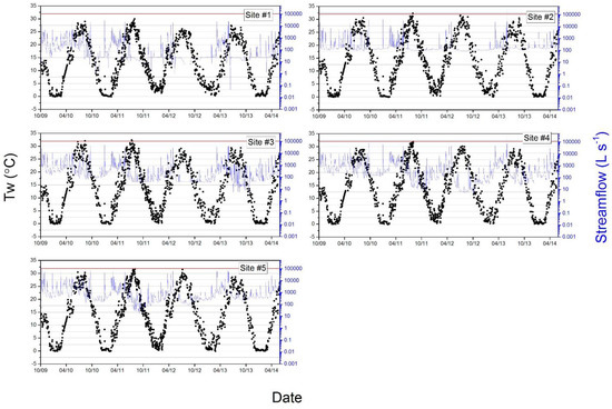 Stream water temperature (Tw) (°C) and streamflow (L s−1) at each gauging site (n = 5) during study period (October 2010–May 2014) in Hinkson Creek Watershed, MO, USA. Red lines depict maximum threshold established by Missouri Department of Natural Resources.