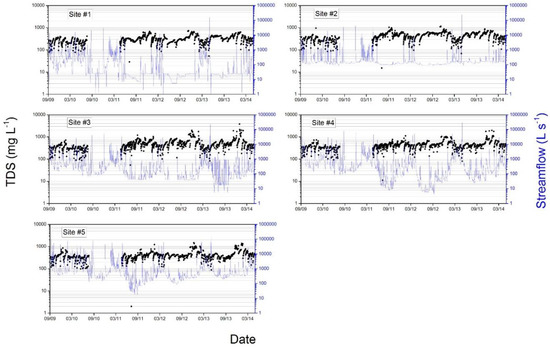 Statistical test results showed significant differences (p < 0.01) between total dissolved solids (TDS) for every site pairing, except sites #2 and #4 (p > 0.5). TDS regimes at all sites displayed seasonality (see below), with maximum concentrations observed during winter months (i.e., 12/8/2012 for sites #1 and #2, 1/29/2014, 2/1/2014, and 1/7/2013 for sites #3, #4, and #5, respectively), and minimum concentrations observed following low-intensity summer precipitation events (i.e., 8/6/2011 for sites #1, #2, and #3, and 8/8/2011 and 8/7/2011 for sites #4 and #5, respectively) (Figure 4). Highest average, median (i.e., with site #2), maximum, minimum, and standard deviation of TDS were observed at site #3 (i.e., mixed-use urban). Whereas lowest average, median, maximum, and standard deviation of TDS were observed at site #1, the lowest minimum was observed at site #5 (Table 4). Given watershed land use characteristics, increasing TDS from site #1 (agriculture) to #3 (mixed-use urban) could be related to an increase in urban land cover (Table 1). Interestingly, the general spatial rend of TDS (i.e., increasing from site #1 to #3, and decreasing from site #3 to #5), contrasts with that reported by Zeiger and Hubbart [24], who noted an opposite spatial trend (i.e., decreasing from site #1 to #3, and increasing from site #3 to #5) for suspended sediment concentrations in Hinkson Creek. The decrease in TDS concentration from site #3 (mixed-use urban) to #5 (suburban), also contrasts with results of works from separate mixed-land-use watersheds [10,14], which reported increasing solute concentrations in the downstream direction. The decreasing spatial trend coupled with streamflow results (Table 3), may suggest the contribution of dilution processes to the physiochemical regime of Hinkson Creek below site #3. While dilution processes may only be “masking” water quality degradation in the lower watershed (e.g., increased loading despite decreased concentration), results nonetheless indicate attenuation of relatively high TDS observed at site #3.