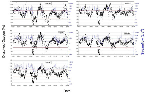 Dissolved oxygen (% of saturation) and streamflow (L s−1) at each gauging site (n = 5) during study period (October 2010–May 2014) in Hinkson Creek Watershed, MO, USA. Red lines depict minimum and maximum thresholds established by Missouri Department of Natural Resources.