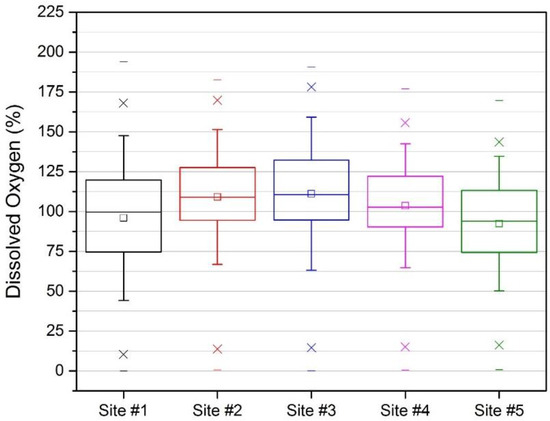 Box and whisker plot of dissolved oxygen (% of saturation) at each gauging site (n = 5) during study period (October 2010–May 2014) in Hinkson Creek Watershed, MO, USA. Boxes delineate 25–75 percentiles. Whiskers delineate standard deviation. Squares within boxes indicate means, lines show medians. X’s indicate 99th percentile when above, 1st when below. Minus symbols indicate maximum when above, minimum when below.