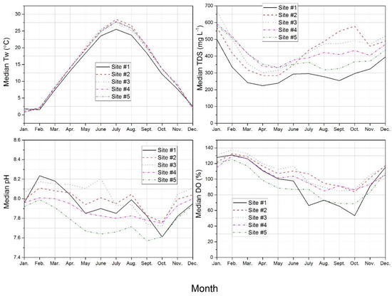 Results indicated seasonal trends for each of the four physiochemical parameters studied (Figure 8). For example, when comparing observations from the cold (i.e., November–April) and warm (i.e., May–October) seasons, five-site-median TDS was 9% greater during the cold season. Similarly, five-site-median pH was 2% greater and five-site-median DO was 75% greater during the cold season than the warm season. The most obvious factor likely contributing to physiochemical parameter seasonality, both directly and indirectly, is air temperature, which displays the same sinusoidal annual trend as water temperature [52] (Figure 2 and Figure 3). Given DO saturation is an inverse function of water temperature [51], the influence of air temperature can be understood to extend to DO regime. However, as illustrated by Figure 8, the DO temporal trend in Hinkson Creek does not cleanly follow that of water temperature. For example, while peak monthly median water temperature (e.g., median of all water temperature measurements conducted in every January of the study) was observed at all sites in July, DO monthly median minimums were not observed until September or October, suggesting a time lag of 2–3 months. Instead, the general DO temporal trend appears to track that of pH more closely.