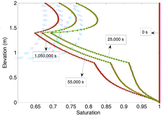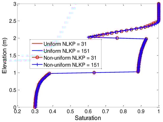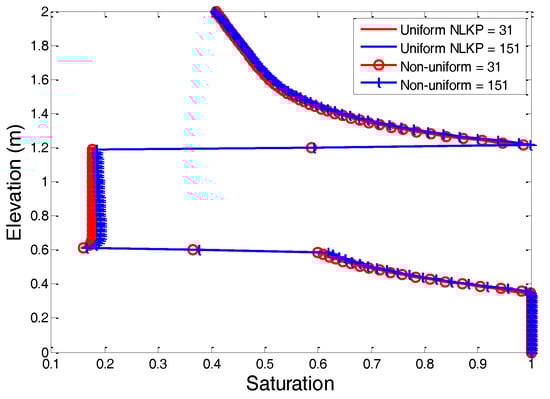 The van Genuchten soil moisture curves for the uniform and non-uniform distribution of lookup points are presented in Figure 9 and Figure 10. The computed water saturation after one day is illustrated in Figure 11 for all cases of uniform and non-uniform distribution strategies. All solutions obtained using both grid discretizations are in good agreement. Although numerical solutions to hydrological models are known to be quite sensitive to grid resolution [,,], both of the grid sizes used in this test problem (60 layers and 120 layers) are sufficient to capture accurately the dynamics of this infiltration test case.