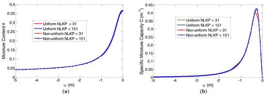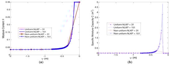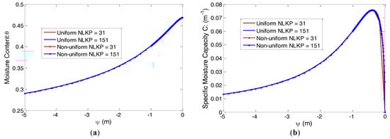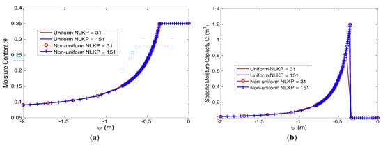 The soil moisture curves of the moisture content () and specific moisture capacity () for the uniform and non-uniform distribution of lookup points evaluated by the Brooks–Corey model are presented in Figure 2 (Soil 1) and Figure 3 (Soil 2). Highly nonlinear natures are clearly shown in the illustrated figures and make good challenges for a numerical algorithm.