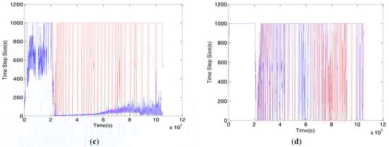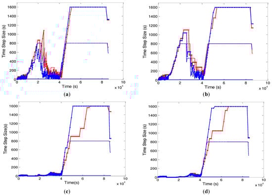 Comparison of time stepping behavior of Picard (a,b) and Newton (c,d) scheme of uniform (red) and non-uniform (blue) of 31 (a,c) and 151 (b,d) lookup points of 120 layers for the step size 10 s (solid), 800 s (dashed) and 1600 s (dot-dashed).
