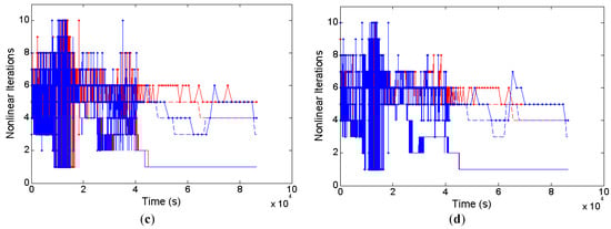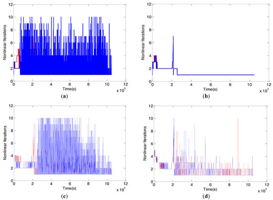Comparison of time stepping behavior of Picard (a,b) and Newton (c,d) scheme of uniform (red) and non-uniform (blue) of 31 (a,c) and 151 (b,d) lookup points for 150 layers.
