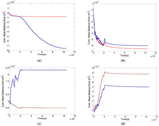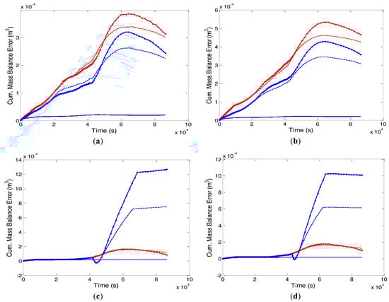 Comparison of cumulative mass balance behavior for Picard (a,b) and Newton (c,d) scheme of uniform (red) and non-uniform (blue) of 31 (a,c) and 151 (b,d) lookup points of 120 layers for the step size 10 s (solid), 800 s (dashed) and 1600 s (dot-dashed).