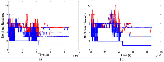To linearize the nonlinear System (21), the most common iterative schemes are Picard and Newton. The Picard iterative scheme is more popular than Newton because the formulation of Picard is simple, and it preserves the symmetry of the finite element matrices. On the other hand, the Newton method requires the evaluation of Jacobian matrices and yields a nonsymmetric system. Because of this, the Picard method is less costly, on a per iteration basis, than the Newton method. The Picard method converges linearly, whereas Newton converges quadratically. Therefore, for some problems or under certain accuracy constraints, Newton gives better convergence behavior than Picard [].