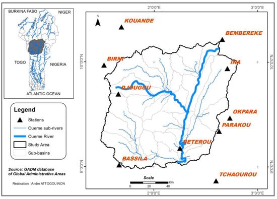 - Lawin, E.A.; Afouda, A.; Gosset, M.; Lebel, T. Variabilité comparée du régime pluviométrique aux échelles régionale et locale sur la Haute Vallée de l’Ouémé au Bénin. In Proceedings of the Sixth World FRIEND Conference, Montpellier, France, 25–29 October 2010; pp. 61–68. [Google Scholar]