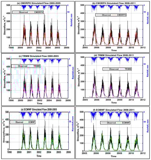 Hydrograph of simulated flow of global precipitation products with observed flow of Gilgel Abbay watershed for the independent calibration mode (a,b) CMORPH, (c,d) TRMM,(e,f) ECMWF.