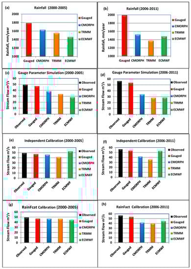 The performance of the model was accessed using gauge-based rainfall data to reproduce a hydrograph with NSCE of 0.82 for calibration and 0.67 for validation periods. The relative bias in both calibration and validation periods is within 5% of the observation for gauged rainfall (Table 2). The daily hydrograph of the three global precipitation products is well fitted for the independent calibration mode (Figure 2). Similarly, the results of the runoff hydrograph using the independent calibration mode shows a much better skill than previous work [,].This may be attributed to the distributed nature of the CREST model The CMORPH and ECMWF reproduced the runoff with NSCE of 0.78 and 0.75 for calibration and 0.71 and 0.72 for validation periods, respectively, under independent calibration mode. The performance of the TMPA 3B42v7 (TRMM) precipitation data is also encouraging with NSCE of 0.71 and 0.66 for the calibration and validation periods, respectively, under independent calibration (Table 2). All the global precipitation products underestimate the mean annual rainfall volume of the in-situ measured mean annual rainfall (Figure 3a,b). Generally, the mean annual runoff estimation decreases from CMORPH to TRMM for both calibration (2000–2005) and validation (2006–2011) periods shown in (Figure 3e,f) for independent calibration. TRMM underestimates the volume of flow relative to the other products with maximum bias of 16.3% and 36.6% in calibration and validation periods, respectively, for independent calibration (Table 2).