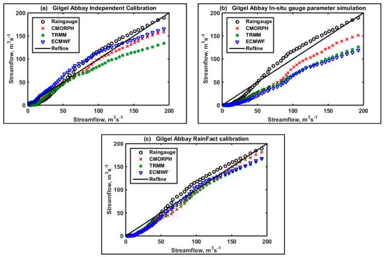 Quantile-Quantile plot of Gilgel Abbay watershed for (a) Independent calibration, (b) In-situ Gauge parameter simulation, (c) RainFact Calibration