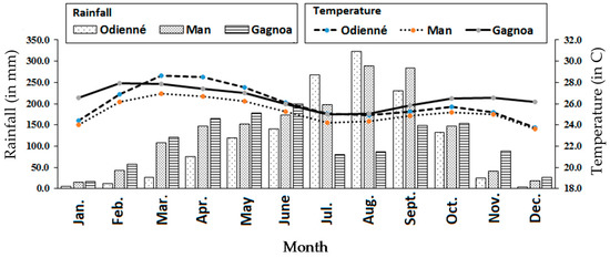 The Sassandra Basin spreads over three different climatic regions where hydrological regimes are quite similar to precipitation regimes [23]. In the south, a humid tropical climate is observed and corresponds to the region of Soubré-Gagnoa. It is characterized by two rainy seasons from March to June and from September to October, and two dry seasons that go from November to February and from July to August. The northern part of the river basin is characterized by a transitional tropical climate or a Sudanese climate (station of Odienné) where the most abundant annual precipitation occurs mostly during the months of July, August, and September. From November to March–April, there is drought. The mountain climate is located in the center-west of the basin in the mountains of Man. This climate is characterized by a short dry season (November to February) and a rainy season that extends from March to October with the precipitation peak in September. The Forest Guinea region is characterized by a long rainy season of 9–10 months. The annual rainfall varies between 1700 and 2500 mm. Figure 2 and Table 1 summarize the characteristics of the basin’s climate.
