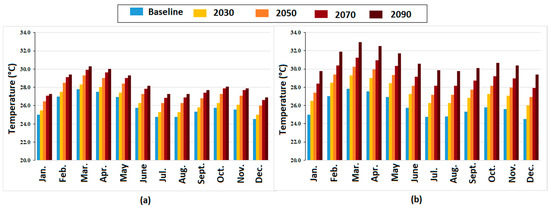 Figure 4. Variation in the monthly interannual mean temperatures for Horizons 2030, 2050, 2070, and 2090 in the Sassandra River Basin: (a) RCP 4.5; (b) RCP 8.5.