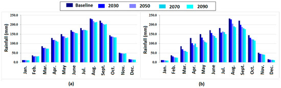 Figure 5. Monthly inter-annual mean rainfall for Horizons 2030, 2050, 2070, and 2090 in the Sassandra River Basin: (a) RCP 4.5; (b) RCP 8.5.