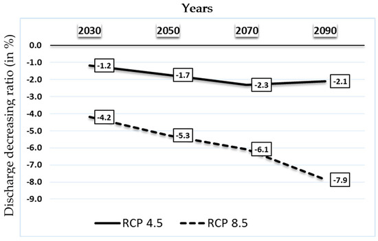 Compared to the baseline (1961–1980), the discharge variation until 2100 was negative. For RCP 4.5, the reduction rate went from −1.2% for Horizon 2030 to a maximum decrease of −2.1% in 2070, followed by a slight rise to −2.3% by 2090. Discharges of RCP 8.5 decreased until it reached a rate of −7.9% by 2090. Thus, we could see that the simulated annual mean discharges varied (decreased) in the same way that the projected rainfall did with the RegCM4 model.