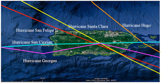 Track of the five most destructive hurricanes passing over Puerto Rico during the 20th century. The different colors represent different hurricane tracks. The name is next to each trajectory [].