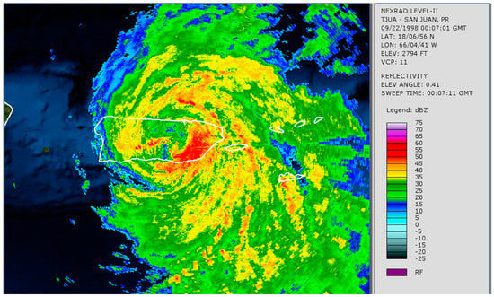 Hurricane Georges became the most destructive hurricane to strike Puerto Rico since Hurricane San Ciprian in 1932 []. According to Guiney, Georges was the second deadliest and second strongest hurricane within the Atlantic basin during the 1998 season []. During its active 17 days, it made landfall seven times and produced 602 fatalities, mainly in the Dominican Republic and Haiti. Georges originated from an atmospheric disturbance on the west coast of Africa, late on 15 September 1998 and became a tropical storm at 12:00 UTC on 16 September centered about 998-km west of the Cape Verde Islands []. Its maximum sustained winds of 250-km/h at 6:00 UTC on the 20th, made it a category IV hurricane on the Saffir-Simpson scale, while located about 459-km east of Guadeloupe in the Lesser Antilles []. Georges made landfall in the southeast of Puerto Rico on the evening of 21 August, with sustained winds of 185-km/h as a category III hurricane near the vicinity of Yabucoa-Humacao [,]. Georges crossed the island of Puerto Rico from East to West during 22 August as it slightly weakened. A sample of reflectivity obtained from the San Juan Weather Surveillance Radar 1988 Doppler (WSR-88D) during Hurricane Georges over Puerto Rico at 00:07:01 UTC of 22 September 1998 is presented in Figure 3.