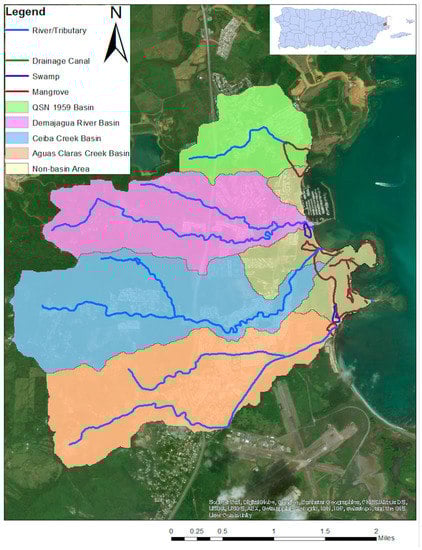 The area of interest (AOI) is located within the municipalities of Fajardo and Ceiba, on the east coast of Puerto Rico. The AOI includes the following watersheds: QSN-1959, Demajagua River, Ceiba Creek and Aguas Claras Creek. This area was selected since the maximum storm surge of 3.05-m occurred near Fajardo. In addition, close to 254-mm of rainfall fell between 21 and 22 September of 1998 at the AOI []. The total area is approximately 19.69-km2 and it includes several urban developments. The delineation of each watershed, the location of each river systems, as well as a satellite image of the area of interest are presented in Figure 4. The remainder of this section presents the land-use cover classification and the surface water hydrology within the AOI.