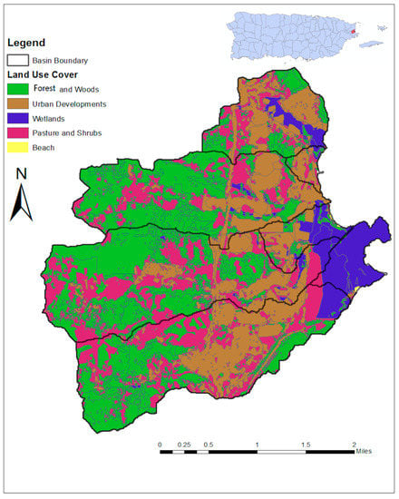 According to the Puerto Rico Planning Board (PRPB), land cover use is distributed as follows: pastures and shrubs cover 59% of the total area, while forest/woods, urban development and wetland represent 25, 11 and 5% of the AOI, respectively []. Figure 5 presents the land-use map within the AOI for 2006. The map was modified to reflect conditions back in 1998. These changes were made by comparing aerial photos from the USGS from 1994 and 2006. Even though no aerial photos were available for 1998, most of the changes can be associated with urban development after 1998. Construction dates of urban development areas were verified with the record of construction from the PRPB.
