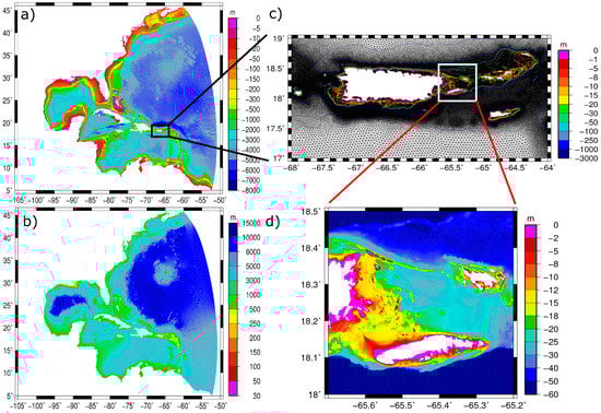 (a) Bathymetry of the full domain unstructured mesh used for the ADCIRC + SWAN simulation (b) spatial horizontal resolution of the unstructured mesh (c) detail of mesh triangulation and isobaths over the Puerto Rico and Virgin Islands region and (d) detail of bathymetry on the east coast of Puerto Rico, where Hurricane Georges had the most significant impact. The highest elevation is represented with the magenta tonality and the lowest elevation is represented with the blue tonality. The islands and territories are represented with the white color.