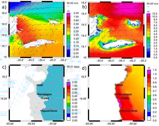 (a) Water surface elevation and (b) significant wave heights at the time of maximum wind speeds and most direct hit of winds to the eastern coast of Puerto Rico. (c) ADCIRC + SWAN water surface elevation before Hurricane Georges in the vicinity of the area of interest and (d) ADCIRC + SWAN maximum water surface elevation during Hurricane Georges. Water levels before Hurricane Georges are shown as a reference of the extent of the maximum storm surge and the labels in (d) outlets used in the ADCIRC + SWAN + GSSHA linking. The highest elevation is represented with magenta and the lowest elevation is represented with dark blue (including the dry inland nodes). The islands and territories are represented with the white and grey color. The river/tributary outlets are identified with their names as QSN, Ceiba, Demajagua and Aguas Claras.