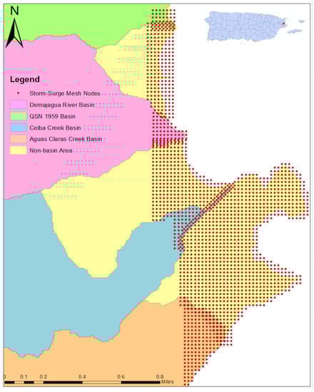 Flood inundation maps are useful for planning and management of floodplains, evacuation routes for communities, definition of no-build zones, development of safe and cost-effective design criteria for hydraulic structures, among other uses []. Tropical storms are associated with heavy downpours, which deposit huge amounts of rainfall over already saturated soils inundating large areas. Coastal zones are also subject to storm surge conditions. Consequently, these areas are affected by the combination of two processes: (i) surface runoff flood due to inland precipitation and (ii) storm surge generated by meteorological and astronomical tides []. The interaction between these effects is critical in determining flood risk in coastal zones []. According to Bacopoulos et al. [] a combined hydrologic-hydrodynamic approach is needed to account for storm surge processes and surface runoff from precipitation. Flooding on coastal zones could be exacerbated by the addition of overland runoff. Flood risk analysis and damage in many coastal watersheds might be underestimated under current Federal Emergency Management Agency (FEMA) floodplain procedures if they do not consider dynamic storm surge boundary conditions in hydraulic models to determine inland flooding risk []. Process-based hydrologic models are becoming increasingly critical in short-term forecasting of inundation dynamics and in situations where complex land-atmosphere coupling is essential for accurate predictions []. Currently, there is no coupled hydrologic storm surge model available for Puerto Rico and the U.S. Virgin Islands. The combined effects of storm surge and surface runoff flooding are not considered when flood inundation maps are created. In addition, there are few detailed studies of extreme hydrological events in the Caribbean islands setting [].
