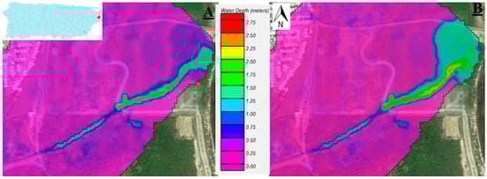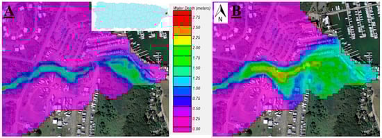 Maximum flood depth for the different flooding scenario at the QSN 1959 Creek watershed. (A) Without storm surge inland penetration; (B) Considering storm surge inland penetration. The color scale represents the water depth in meters, where the red color indicates the maximum value and the magenta color represents the minimum value.
