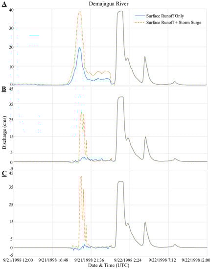Discharge hydrograph for the different flooding scenario and at different locations for the Demajagua River watershed. (A) At 0-m from the stream outlet; (B) At 50-m from the stream outlet; (C) At 100-m from the stream outlet. The “Surface Runoff + Storm Surge” flooding scenario is represented with orange dots line and the “Surface Runoff Only” flooding scenario is represented with a solid blue line. The discharge is expressed in cubic meters per second (cms).