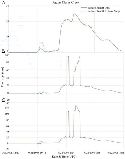 Discharge hydrograph for the different flooding scenario and at different locations for the Aguas Claras Creek watershed. (A) At 0-m from the stream outlet; (B) At 50-m from the stream outlet; (C) At 100-m from the stream outlet. The “Surface Runoff + Storm Surge” flooding scenario is represented with orange dots line and the “Surface Runoff Only” flooding scenario is represented with a solid blue line. The discharge is expressed in cubic meters per second (cms).