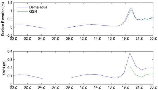 ADCIRC + SWAN water surface levels at Demajagua (blue) and QSN 1959 (green) outlets during Hurricane Georges (Top). Notice how the tide penetrates into Demajagua while not into QSN 1959. ADCIRC + SWAN significant wave heights (SWH) at Demajagua and QSN 1959 outlets (Bottom). Notice how the waves reach into QSN 1959 later than the water levels, showing the fine detail achieved by the model. The plotted period is from 21 September 1998 0:00 UTC to 22 September 1998 0:00 UTC.