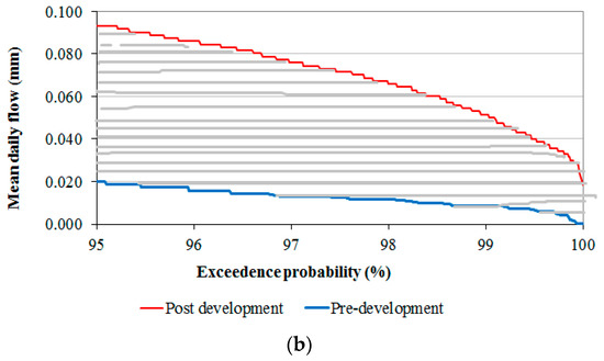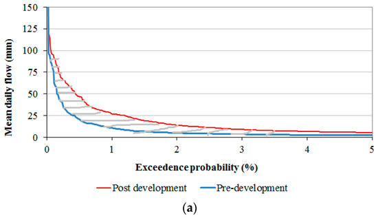 The concept of the eco-deficit and eco-surplus method (which was originally developed for regulating flows through dams in an ecologically sustainable way) offers a simplified graphical representation of hydrologic impacts using FDCs. This is an excellent tool for interpreting the hydrologic changes overall and for making a preliminary judgment on stream health. The user can visualize the hydrologic changes and easily interpret the impacts of those hydrologic changes on stream health. It should be noted that this metric alone is insufficient to adequately capture detailed hydrologic changes, because the hydrologic variations occur in terms of magnitude, timing, duration, frequency, and rate of change. In this approach, timing and seasonality can be addressed to some extent, because the eco-deficit and eco-surplus can be computed over any period of interest (monthly, annual, or seasonal) and reflect the overall changes in streamflow [46].