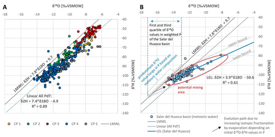 In comparison to that, Figure 4B summarizes a collection of stable isotope data (91 samples) from the Salar del Huasco basin (spring, river and groundwater). The Salar del Huasco basin abuts on watersheds draining into the PdT (Figure 1B). Contrary to the trend line of samples of the PdT, the trend line of data from the Salar del Huasco basin exhibits a slope of 3.9 (R2 = 0.61), which is in accordance with empirically established LELs for the study area (Section 2).