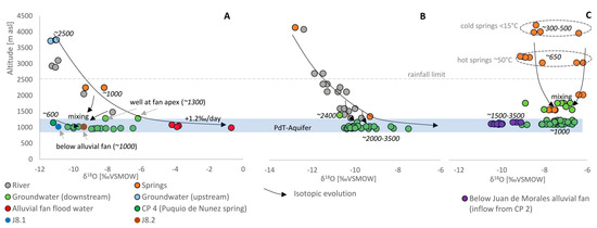 The assessment proposes that rainwater falling in the Juan de Morales basin exhibits predominantly δ18O values between −11 and −7‰ (Figure 8A). On the contrary precipitations in CP 6 and CP 5 would exhibit dominantly δ18O values from ~−17‰ to −13‰ (in accordance with the assessment in Section 5.1) and in CP 4 from ~−19‰ to −13‰. The precipitations alimenting meteoric waters in CP 2 would show δ18O values of dominantly ~−15 to −11‰. The respective signals lose in intensity downstream—below the rainfall limit of ~2500 m a.s.l.—where groundwater mixing processes become more significant and hence respective values are being averaged (Figure 8A).