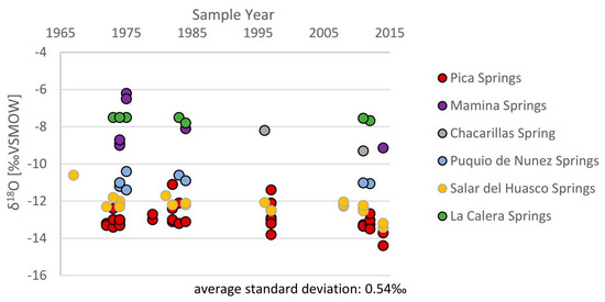 The correlation structure that is being mapped by the kriging models (Figure 2A,B) is that of the spatial distribution of the isotopic composition of meteoric waters in the region. The respective RMSE and ASD of both models (δ2H model: RMSE = 6.82‰, ASD = 5.92‰ and δ18O model: RMSE = 0.89‰, ASD = 0.80‰) are relatively low and reasonable when considering that the dataset consists of different kinds of meteoric water (surface and groundwater) and includes samples of campaigns spanning over a period of ~50 years. Particularly spring sites were sampled several times during that period. δ18O measurements at these springs show an ASD of 0.54‰ (Figure 5), which is quite close to the ASD of the respective kriging model (ASD of respective δ2H values is 4.2‰). However, the low ASD of isotopic measurements at springs also demonstrates that the isotopic composition of groundwater at different localities is not exposed to prominent (seasonal) variations. That is reasonable when taking into account that groundwater in the Atacama Desert exhibits typically corrected residence times of a few thousand years (e.g., Pica springs and Puquio de Nunez spring [3,10]). Long residence times damp signals of slightly varying seasonal variations due to mixing within the respective reservoir. Hence, extreme isotopic values—as associated with depleted rains during storm events—are smoothed out in the given spring data (as far as observed). Applying this insight to other groundwater measurements in the region implies that the observed isotopic conditions—as visualized by the kriging models—reflect long-term averaged conditions due to subsurface mixing within each compartment. However, based on the given dataset alone it is impossible to quantify or further distinguish these mixing processes.
