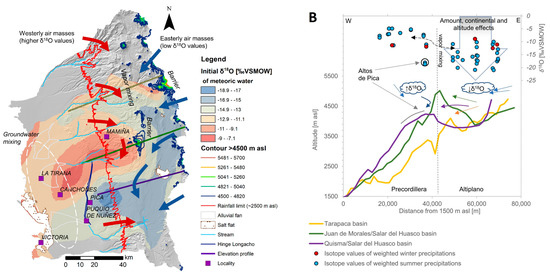 (A) Approximate initial δ18O values of meteoric waters in the study area prior to evaporation-driven fractionation. The map is based on the interpolation data of the kriging models for δ18O and δ2H (Figure 2A,B), arrows indicate suggested air mass contributions, (B) Schematic sketch of proposed topographic controls of isotope values in precipitations contributing to recharge in the PdT (isotope data of rain originates from Fritz et al. [3], Uribe et al. [8], and Aravena et al. [23]).