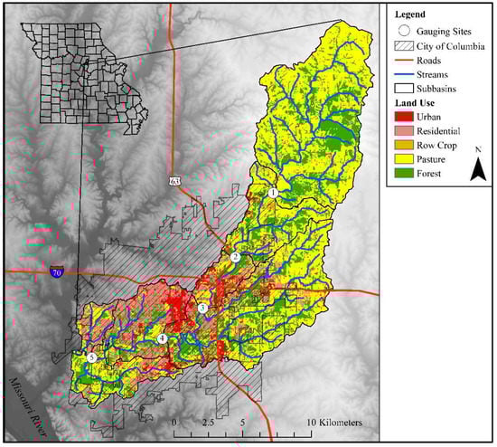 The main channel of HCW, Hinkson Creek, is approximately 56 km in length (including meandering) (Table 1); flowing southwesterly from the headwaters in Hallsville, Missouri through Columbia, Missouri to its confluence with Perche Creek. After confluence with Perche Creek, Hinkson Creek flows approximately 18 km (including meandering) through Perche Creek to its confluence with Missouri River. During winter 2008, Hinkson Creek was instrumented with a nested-scale experimental watershed study design []. Five hydroclimate gauging sites were positioned along the main channel to divide HCW into five sub-basins. (Table 1, Figure 1). Site #5 is located near the watershed outlet, and Sites #1 to #4 are nested within (Figure 1). At Site #4, the stage of Hinkson Creek has been intermittently monitored since 1967 using a USGS gauging station (#06910230).