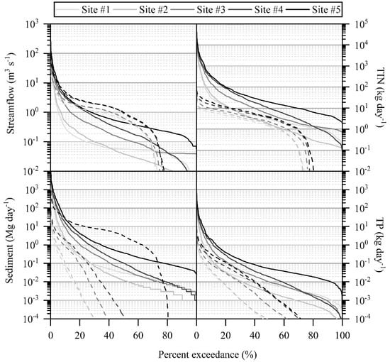 Results showed agricultural and urban development increased maximum flows, which translated to increased maximum pollutant loading in HCW. Differences in maximum streamflow ranged from 12 m3 s−1 (Site #1) to 166 m3 s−1 (Site #5). Differences in maximum daily sediment loading were relatively greater, ranging from 36 kg km−2 (Site #2) to 60 kg km−2 (Site #1). Differences in maximum daily TP loading were also large ranging from 23 kg km−2 (Site #2) to 53 kg km−2 (Site #5). Differences in maximum daily TIN loading were the greatest, ranging from 113 kg km−2 (Site #2) to 201 kg km−2 (Site #5). Increased pollutant loading was expected considering approximately 50% of total watershed area that was native forested land cover was cleared for agricultural and urban development in the study catchment. In addition, approximately 12% of the land cleared was replace with impervious surfaces associated with increased volume and velocity of surface runoff, and subsequent increases in peak flow in HCW []. However, the results that are indicated differences in streamflow alone did not account for the observed pollutant loading in HCW. For example, flow and load duration curves show increased median streamflow did not translate to increased median pollutant loading (Figure 2). Model simulations showed that increased pollutant export (especially TIN loading) was also due to differences in management operations (i.e., fertilizer applications, grazing, and lawn fertilizer applications).