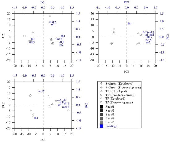Bi-plot showing scores generated from simulated pre-development and observed developed loading data at five gauging sites in Hinkson Creek, Missouri, USA. Loadings of indices with the greatest absolute loadings for eight loading sub-components are also shown. PC1 and PC2 are principal component axes. Definitions of indices are shown in Table 5. Loading indices that overlapped were slightly offset to improve readability. Total inorganic nitrogen is TIN, and total phosphorus is TP.